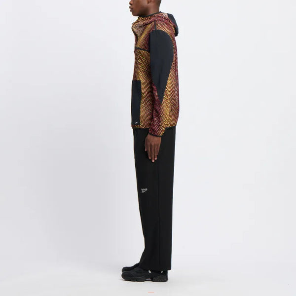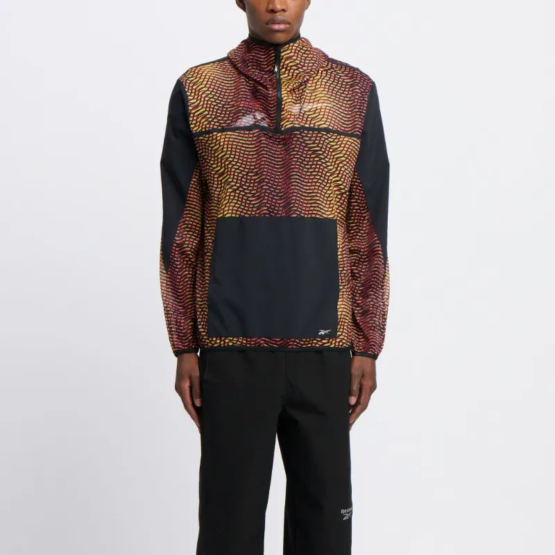 This jacket is designed for active days on the go. crafted from lightweight mesh with woven overlays on the arms and a hood for extra coverage, and printed with a graphic motif that nods to Reebok's confident approach to sportswear.